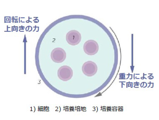 リアクターが回転することで、上向きの力と重力による下向きの力とのバランスで、スフェロイド/オルガノイドが培地中に浮遊する状態を作り、その浮遊環境を長期間保ちます。