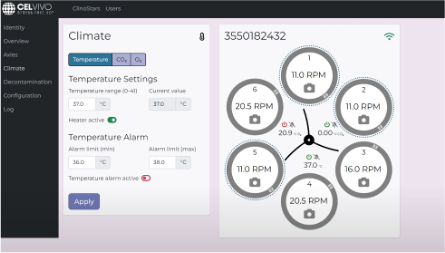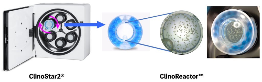ClinoStar2®は、インキュベーター機能を備え独立した6個のリアクターを搭載した、細胞を回転浮遊させる3次元の培養装置です。撹拌翼のないユニークなリアクターの回転により、細胞を浮遊状態に保ち、せん断応力の極めて少ない低ストレスの環境の中で長期間安定した培養が可能です。扉に設置された6個の独立したカメラにより、タブレットおよびスマートフォンやPCからリモートで、培養状況のモニタリングや設定操作がいつでもどこでも可能です。