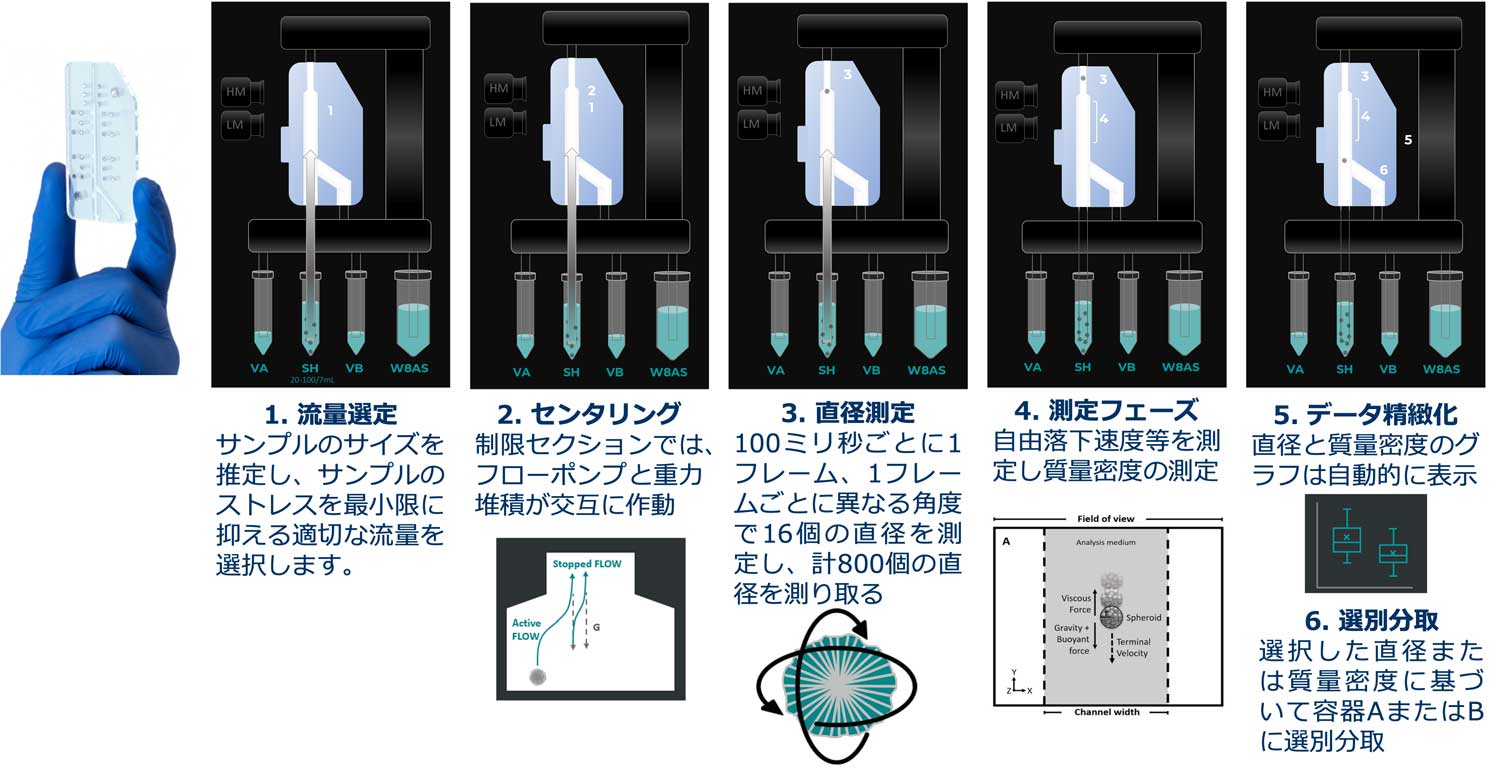 オルガノイド・スフェロイドを専用チップの流路中に自由落下させ、質量密度を3次元で測定を行い分取します。サンプルを研究に適切な質量密度に応じ正確に分析分取できます。